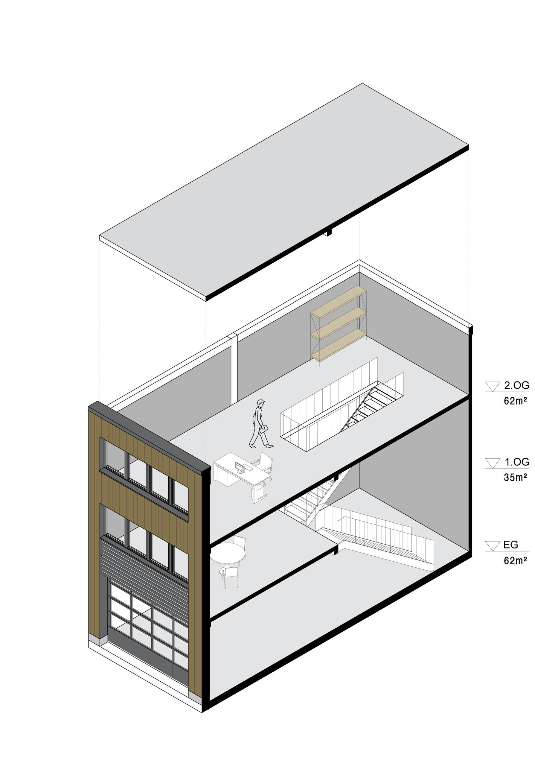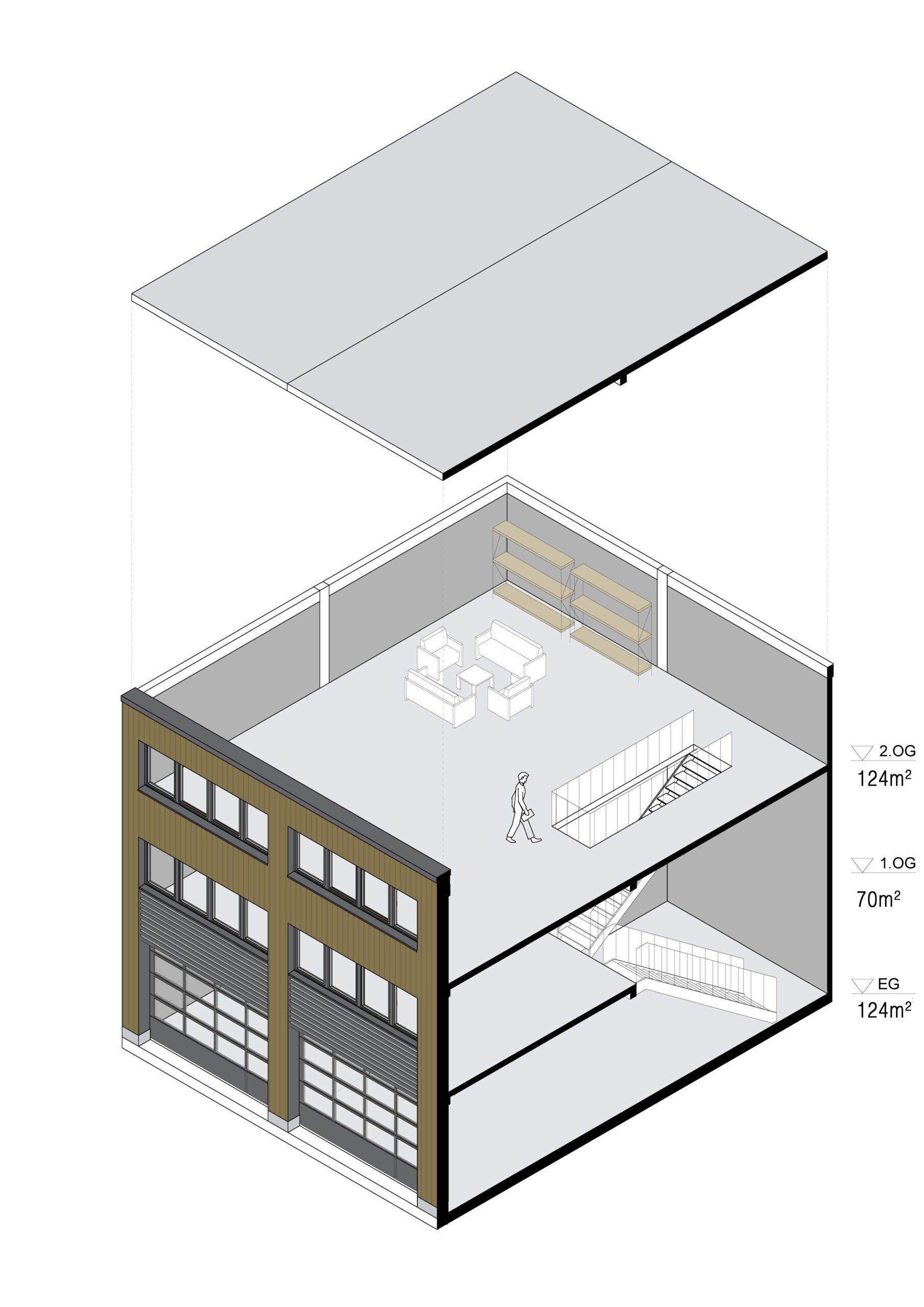 Die Werk-Lofts verbinden auf zwei oder drei Ebenen Lager-, Werkstatt- Produktion- und Büroflächen. So entstehen effiziente Arbeitsbereiche mit klarer funktionaler Gliederung und kurzen Wegen. Sie verfügen über eigene Zugänge mit Sektionaltor und separater Tür.