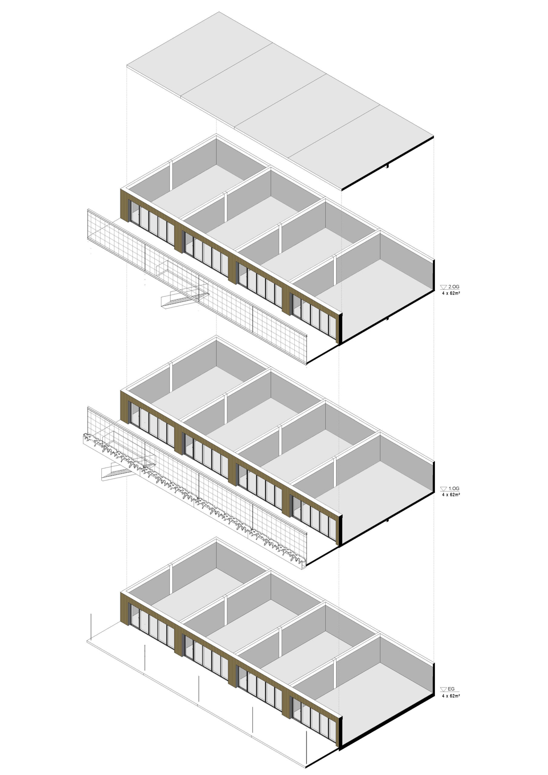 In den repräsentativen Kopfgebäuden ergänzen 24 Stadt-Lofts mit jeweils 65 m² das Angebot. Diese sind flexibel kombinierbar (65 bis 260 m²) und ermöglichen eine einfache Skalierung je nach Bedarf. Die Stadt-Lofts werden über eine vorgelagerte, begrünte Stahlskelett-struktur mit Treppen erschlossen.