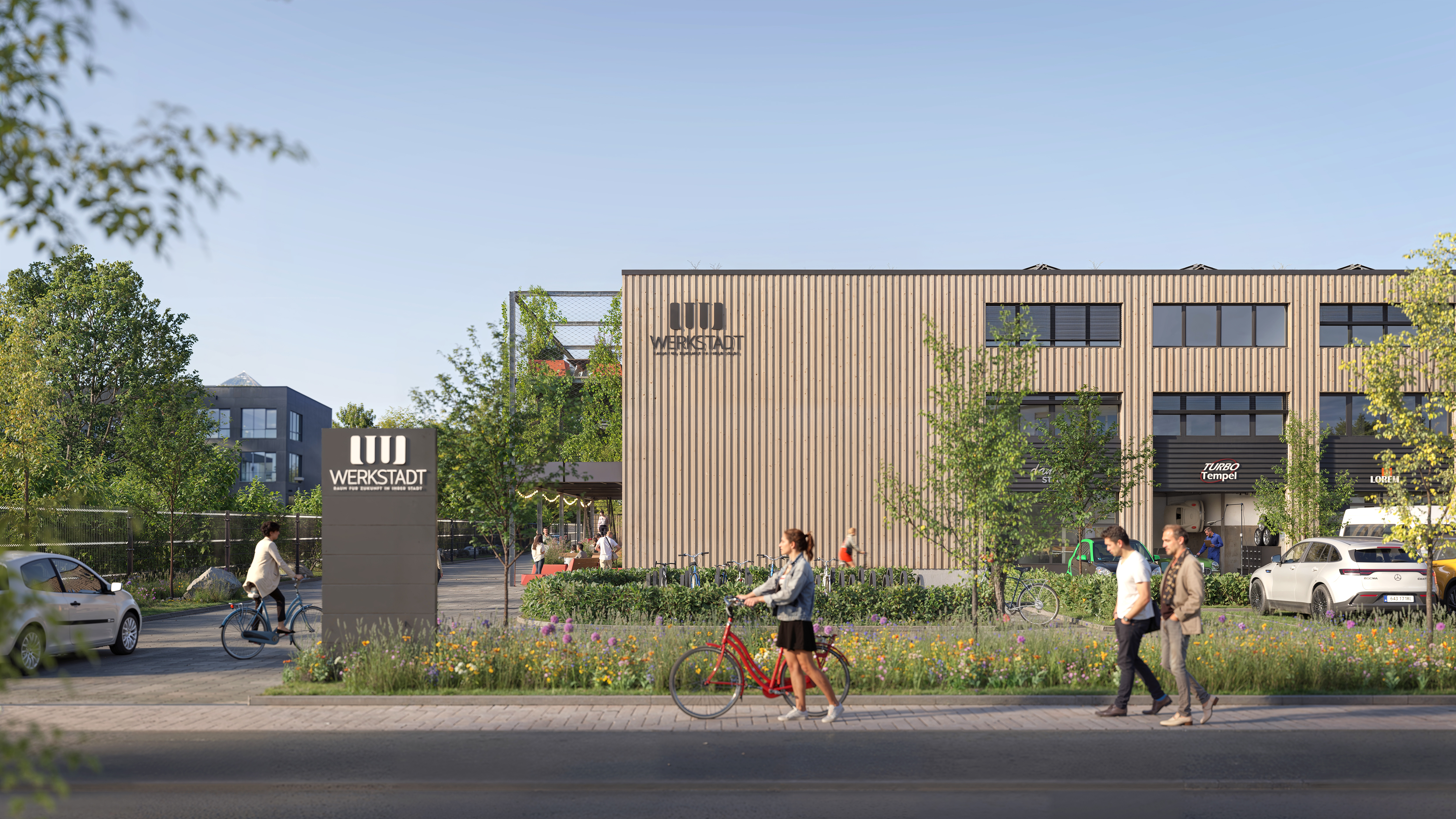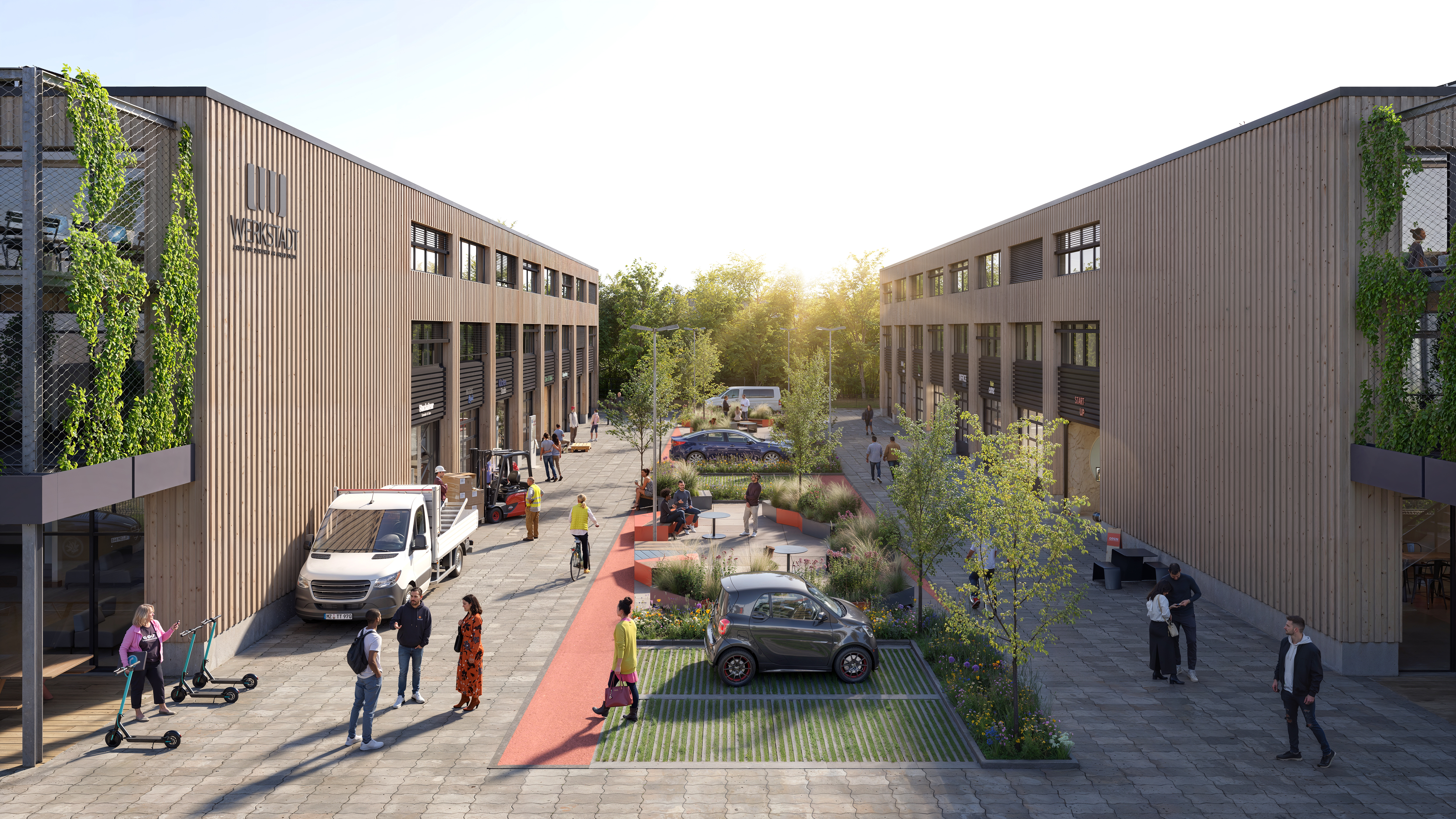 Viele Gewerbegebiete stammen aus den 1960er bis 1980er Jahren und weisen ökologische Defizite auf. Die WerkStadt setzt hier an – durch intelligente Nachverdichtung und nachhaltige Architektur. Begrünte Dächer und Fassaden, energieeffiziente Bauweisen sowie eine hohe Aufenthaltsqualität verwandeln bestehende Strukturen in moderne, lebenswerte Arbeitsorte.